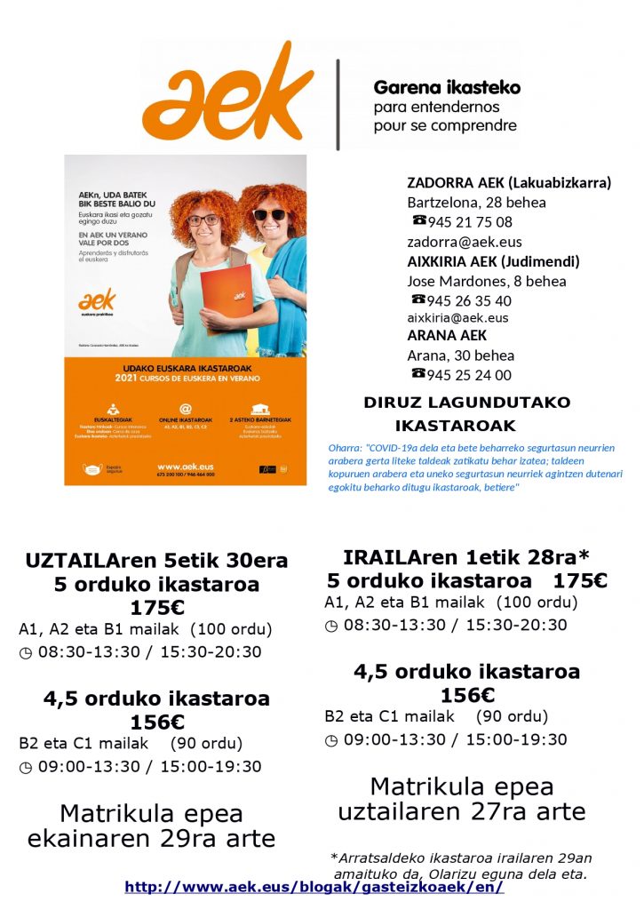 Urtero bezala, 2021eko udan ere Gasteizko AEKk ikastaro trinkoak eskainiko ditu uztaila eta irailean. A1, A2 eta B1 mailetan egunean 5 ordu (100 ordu guztira) eskainiko ditugu, B2 eta C1 mailetan, aldiz, egunean 4,5 ordu (90 ordu guztira). Goizeko edo arratsaldeko ordutegia eskainiko dugu. MATRIKULA ZABALIK!