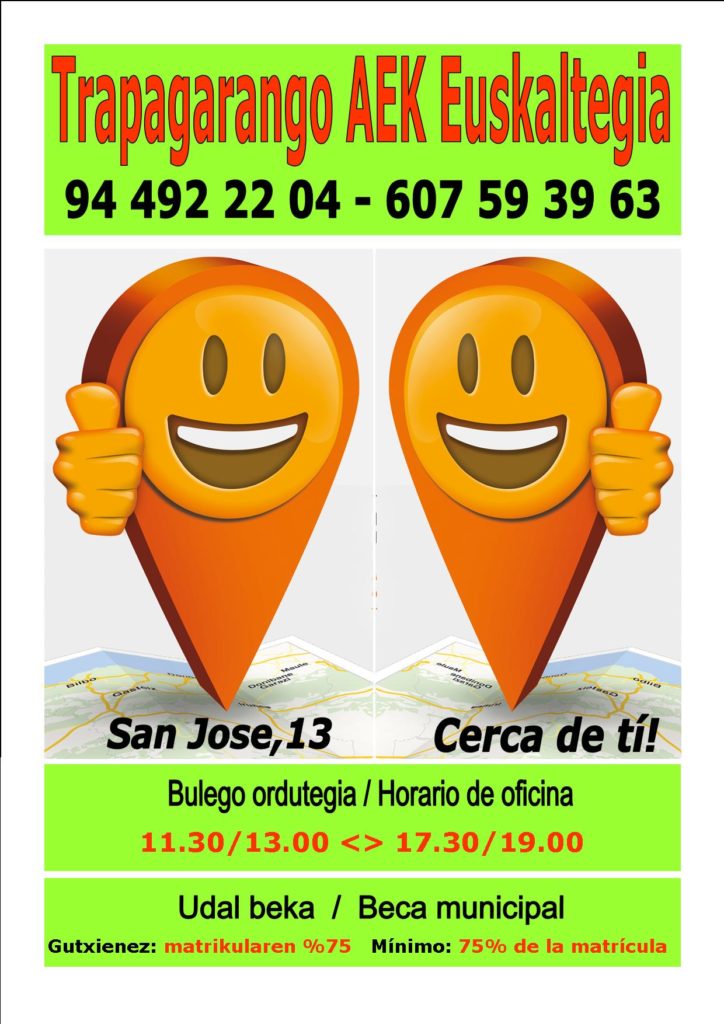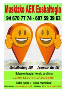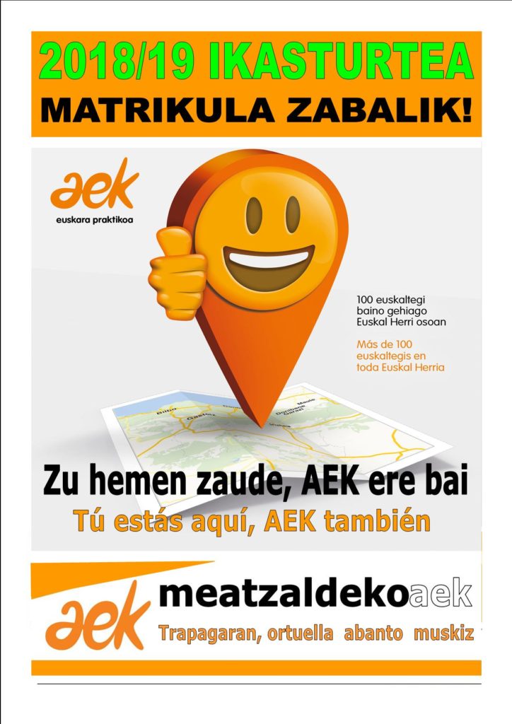 Hemen gaude berriro. Tira, bada, hobeto esanda, hementxe gaude, beti bezala. Zugandik hurbil, euskara hobetzen laguntzeko prest. Horren harira, zera esan nahi dizugu, ikasturte honetan, ikasteko oso aukera zabala eta edonoren behar eta nahietara egokitua eskaintzen dizugula. Bestetik, jakin behar duzu eskura izango duzun diru-laguntza ere inoizko handiena dela. Zu berton zaude, Meatzaldeko AEK euskaltegiak ere bai, eta 2018/19 ikasturteko bidea elkarrekin jorratzea, poz ederra litzateke guretzat. Aldez aurretik, beraz, ongi etorri gurera!