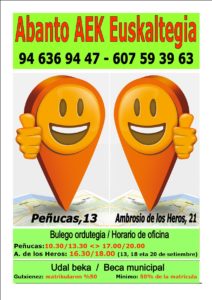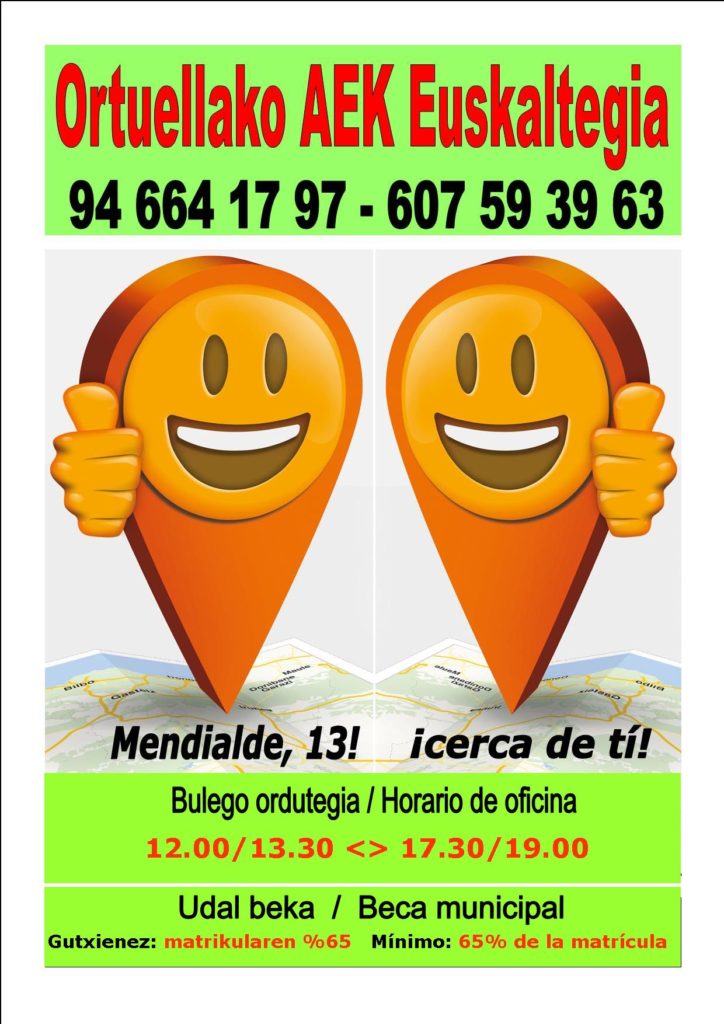 Aquí estamos de nuevo. Bueno, mejor dicho, aquí estamos, como siempre, a tu lado, siempre dispuestos a ayudarte con el euskera. En este sentido, queremos decirte que, para el nuevo curso, tenemos una oferta lectiva, de días y número de horas a la semana, capaz de adaptarse a los gustos y necesidades de “casi” todos los alumnos. Además, tienes a tu disposición un abanico de ayudas públicas, que rebaja como nunca el precio de la matrícula. Tú estás aquí, y los euskaltegis de Meatzaldeko AEK también. Y, para nosotros, sería una alegría que recorriéramos juntos el camino del curso 2018/19. Bienvenido!