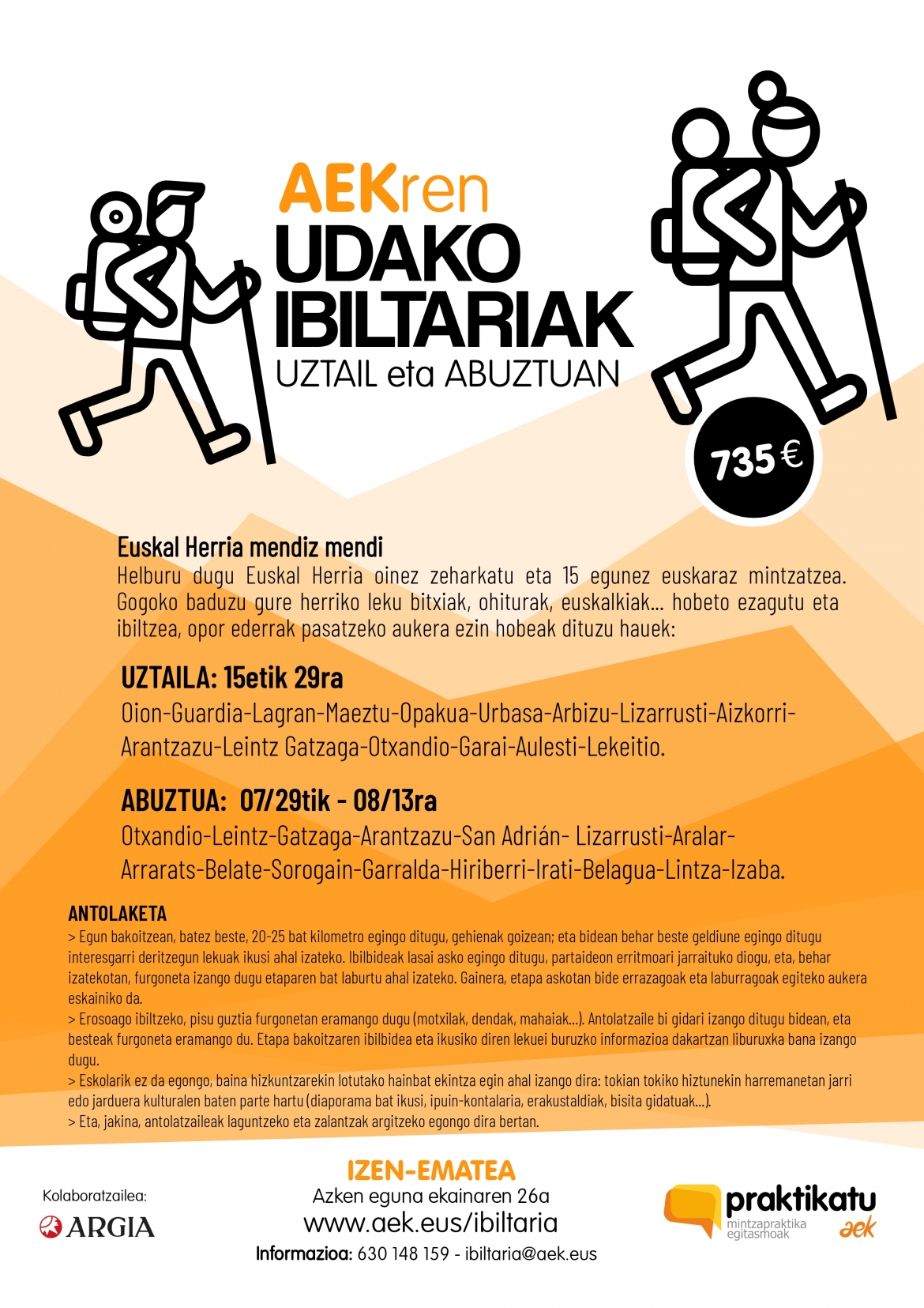 Helburu dugu Euskal Herria oinez zeharkatu eta 15 egunez euskaraz mintzatzea. Gogoko baduzu gure herriko leku bitxiak, ohiturak, euskalkiak… hobeto ezagutu eta ibiltzea, opor ederrak pasatzeko aukera ezin hobeak dituzu hauek: