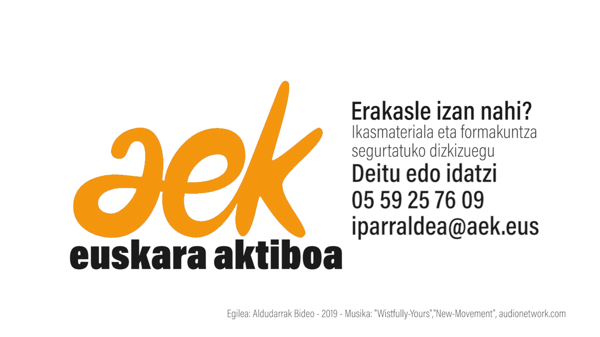 Los datos personales facilitados serán tratados por Euskaraz Kooperatiba Sozietatea (AEK) como responsable del tratamiento, para la gestión de las consultas y solicitudes de información recibidas. Puede acceder, rectificar y suprimir sus datos, así como ejercer otros derechos en la dirección: Helbide elektroniko hau spam roboten kontra babestuta dago. JavaScript aktibatuta eduki behar duzu hau ikusteko., como se explica junto a información adicional de protección de datos en nuestra política de privacidad.